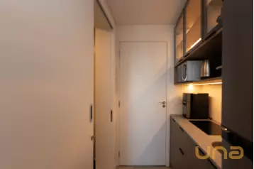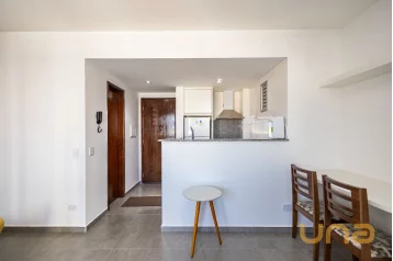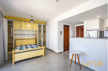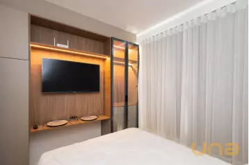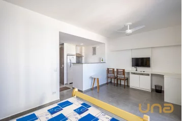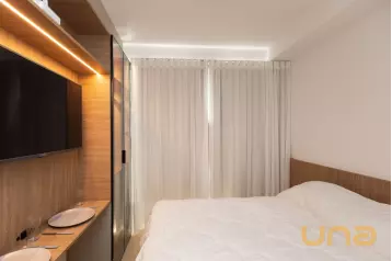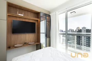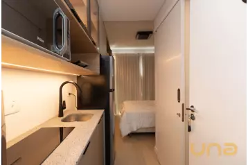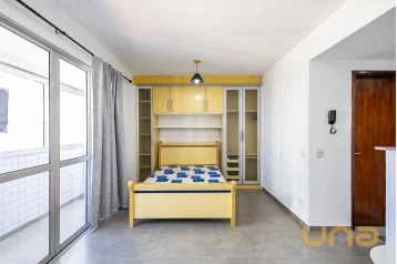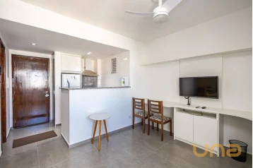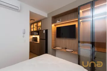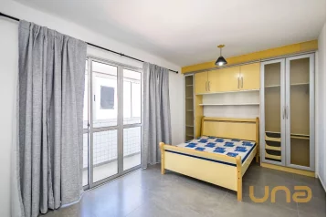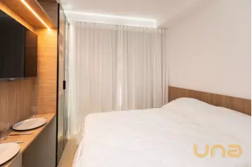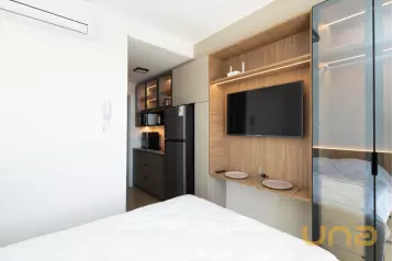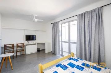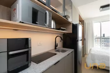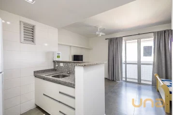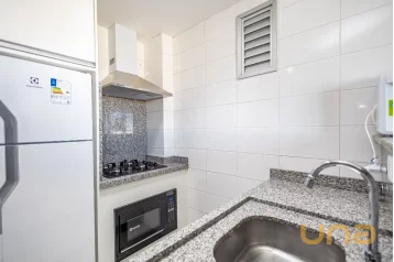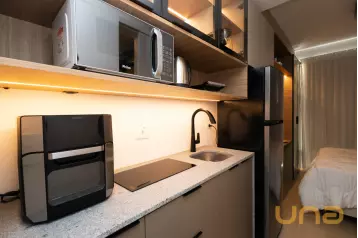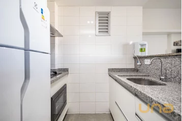 Quarto com cama box casal, criado mudo, closet, mesa com 1 cadeira; Sala com sofá 2 lugares, painel de TV, armários; Sacada; Banheiro com chuveiro elétrico; Cozinha com armários planejados, pia com balcão e pedra granito, refrigerador, cooktop, mesa passa prato com 3 cadeiras.
