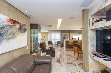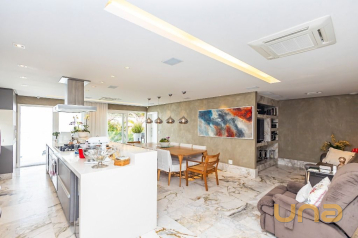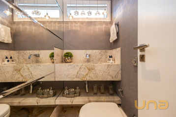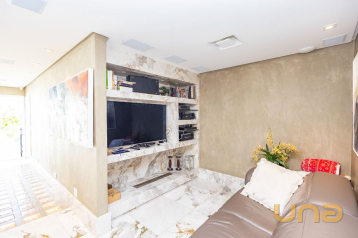 No 1º piso temos o Hall Social, Lavabo, Escritório, Amplo Living dividido em 02 ambientes por uma lareira (pé direito duplo), Sala de Projeção, Ampla Copa/Cozinha, em anexo temos uma Ampla área Gourmet, contendo uma churrasqueira completa, sala de estar e lavabo, jardim e quintal,